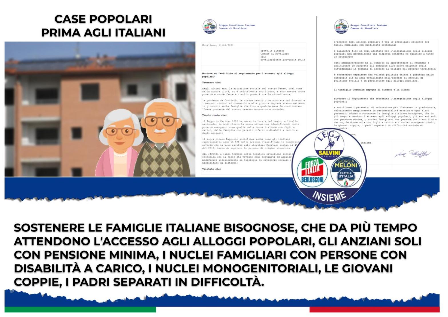 a modificare i parametri di valutazione per l’accesso in graduatoria, valorizzando maggiormente la residenzialità storica e ogni altro parametro idoneo a sostenere le famiglie italiane bisognose, che da più tempo attendono l’accesso agli alloggi popolari, gli anziani soli con pensione minima, i nuclei famigliari con persone con disabilità a carico, le donne sole con figli a carico e i nuclei monogenitoriali, le giovani coppie, i padri separati in difficoltà sociale ed economica.